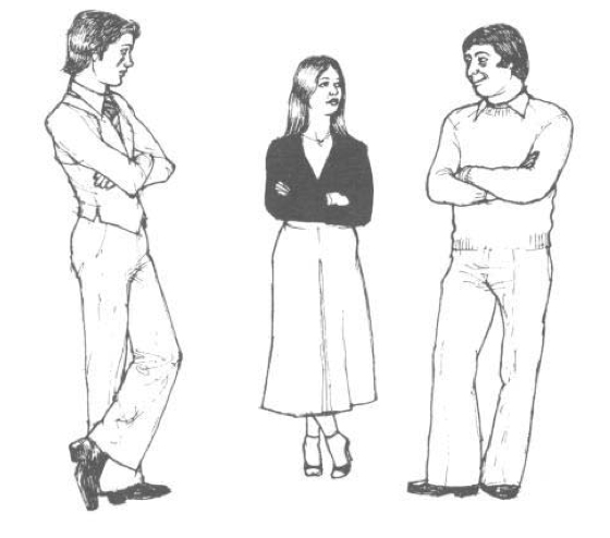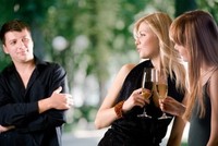 Wat zie je aan deze man? Als je naar zijn gezichtsuitdrukking en de afstand tussen hem en de vrouwen, zou je kunnen denken dat hij niet goed op weg is, en dat hij geen schijn van kans maakt. Maar toch niet. Kijk naar hoe de vrouw rechts over de schouder van haar vriendin heen kijkt. Vrouwen kijken vol nieuwsgierigheid over schouders heen... tot die cruciale seconde van aantrekking of geen aantrekking plaatsheeft. Deze twee zullen elkaar vinden...