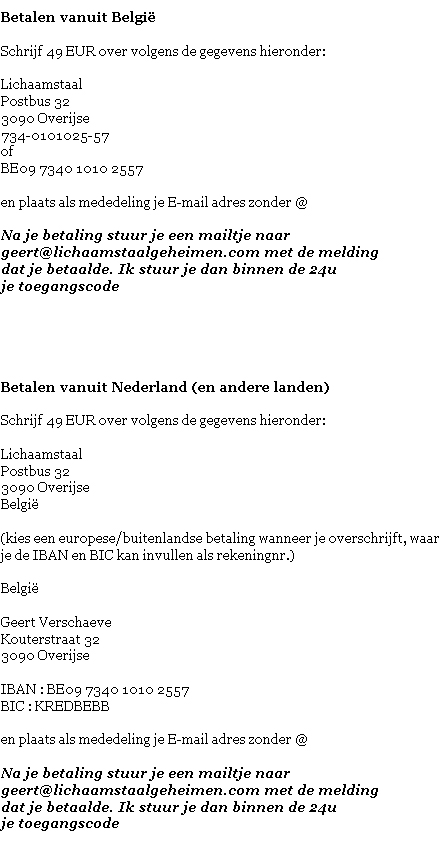 Je kan via Paypal betalen (en meteen starten), of je kan via Overschrijving betalen en binnen 24u starten.